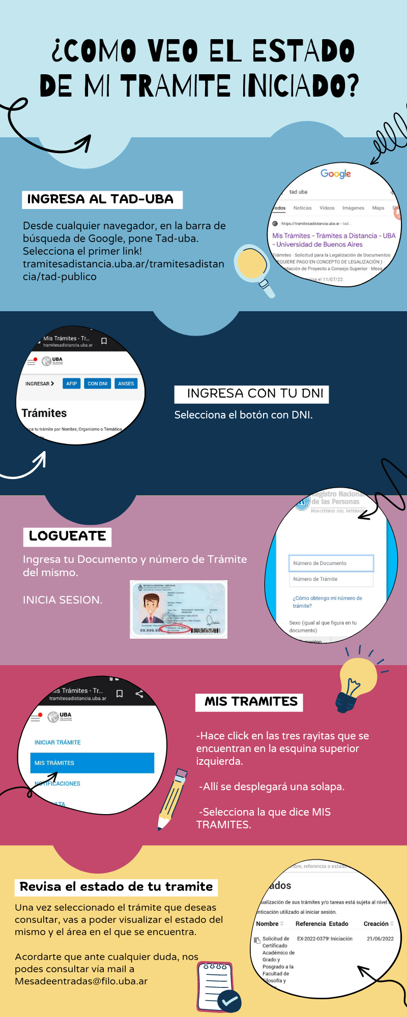 • Los TAD-UBA iniciados por usted pueden ser consultados ingresando con su DNI en https://tramitesadistancia.uba.ar. Al final de la página usted puede descargar una guía rápida para reliazar su consulta en relación a los TAD-UBA que haya iniciado.