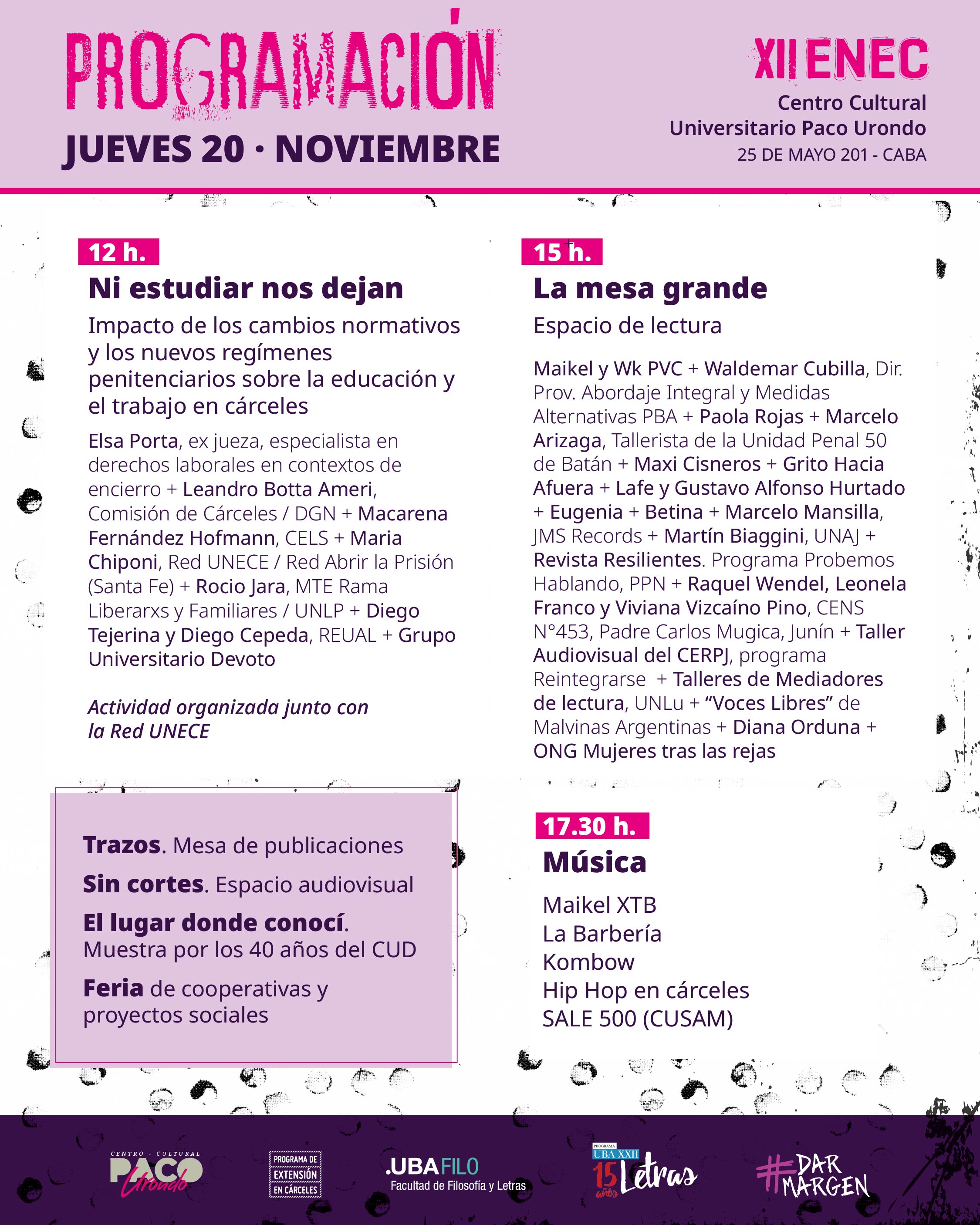 El jueves 20 de noviembre se realizará el XII ENEC 2025, organizado por el Departamento de Letras, el Programa de Extensión en Cárceles y el Centro Cultural Universitario Paco Urondo, junto con la Asociación Civil Dar Margen.